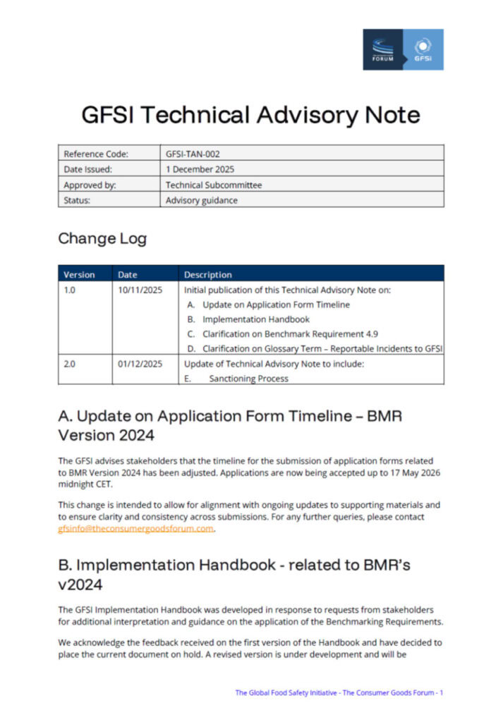 GFSI has created the Technical Advisory Note (TAN) as a mechanism to provide timely clarification on the intent, interpretation, or expected application of the existing Benchmarking Requirements (BMR).